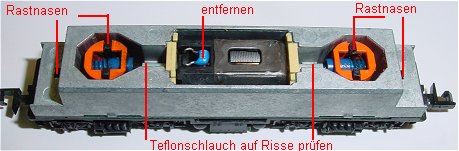 zusammendrücken und das Teil nach oben herausnehmen. Dabei läst sich der Teflon-Verbindungsschlauch von der Motorwelle.