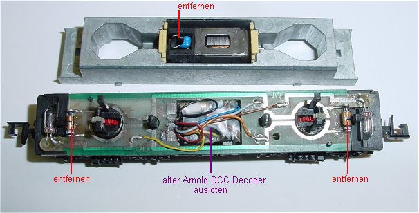 Der Kondensator am Motor wird entfernt. Die Dioden an den Lampen werden entfernt. Der alte Decoder wird ausgelötet.