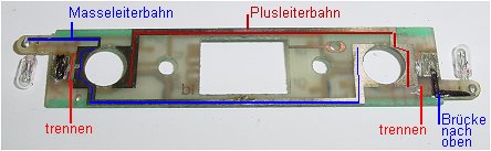 oben verdrahtet. Auf einer Seite wird die Lampenzuleitung Masse vom Schleiferblech getrennt. Hier ein 0,3 mm Loch durch