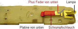 Hier wurde die U-förmige Feder zu 2/3 mit Schrumpfschlauch isoliert. Nur das Stück, auf welchem die Plusfeder Kontakt hat