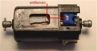 Der Motor wird herausgenommen und der Kondensator entfernt (bei Selectrix ein Muss)
