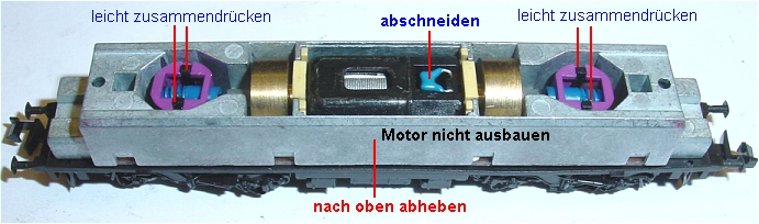 Der Kondensator wird abgeschnitten. Die Drehgestelle werden durch Zusammendrücken der Rastnasen nach unten herausgenommen.