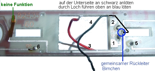 Der alte Decoder mit blauem Kabel für die Lampenmasse. Hier wird eine Verbindung vom Lötpunkt bl zur Unterseite schwarzes