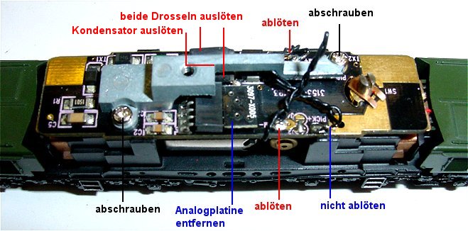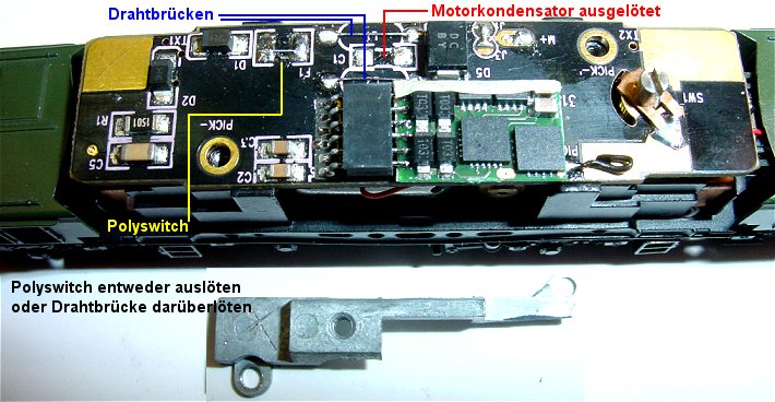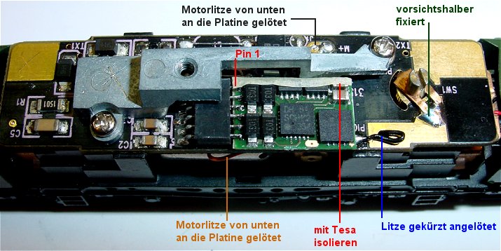 Motorlitze oben grau, unten orange von unten an die Platine angelötet, dadurch Platz geschaffen für den Decoder. Hängen die