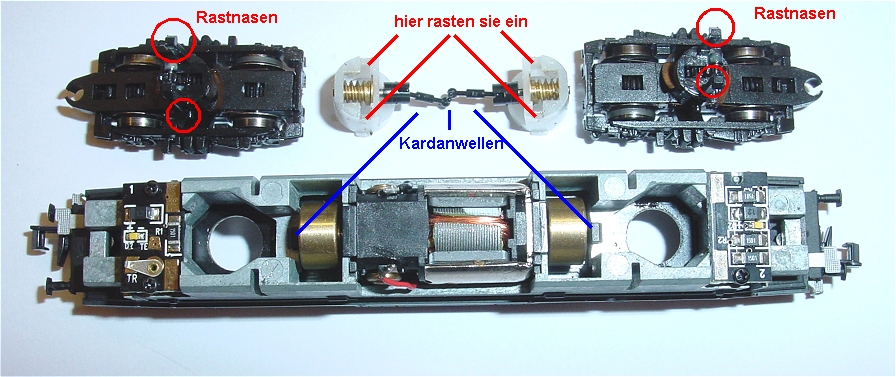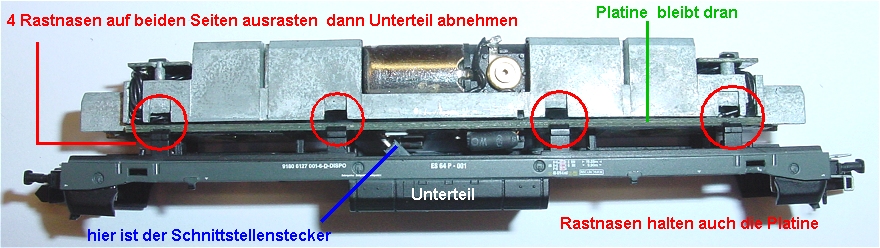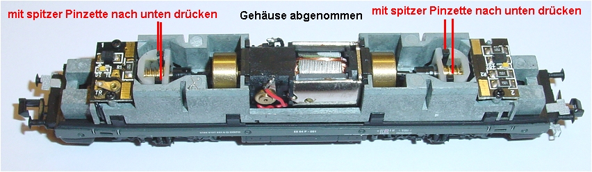 Nun werden die Drehgestelle ausgebaut. Dazu mit spitzer Pinzette die jeweils 2 Rastnasen nach unten herausschieben, die