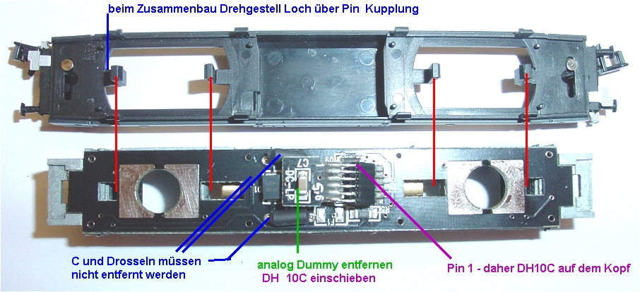 Decoder ist eingebaut. Pin 1 Buchse ist markiert, Pin 1 Decoder ebenfalls. Es wird nun die Bodenplatte aufgeklippst. Die