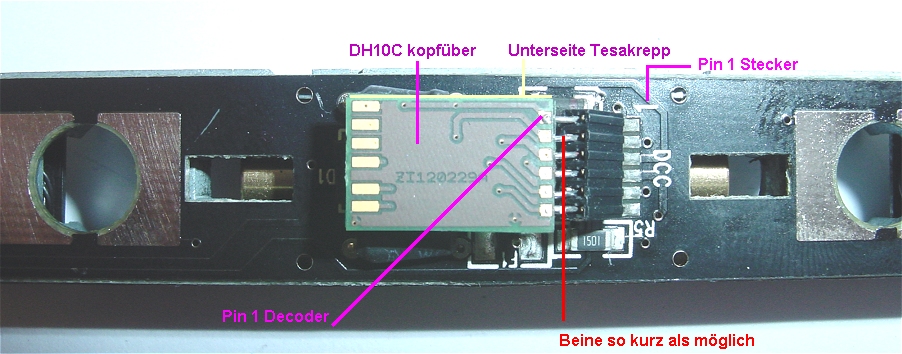 werden. Die Bauteileseite des Decoders wird mit Tesakrepp isoliert. Nach dem Einschieben kopfüber wird der Decoder leicht