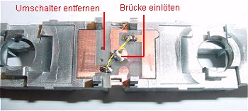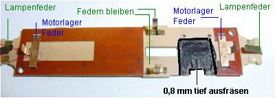Im Gehäuse beide Federn unter den Stromabnehmerschrauben entfernen. Führerstand 1 auf Metallblock markieren hier ist später