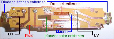 So sieht die entstrippte Platine aus. Drossel, Kondensator und beide Diodenplättchen werden entfernt. Dioden könnten bleiben,