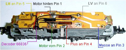 offenen Leiterbahnseite des Decoders Kurzschlüsse verhindert. Pin 1 ist links im Bild. An die Motorwellenlager sollte 1