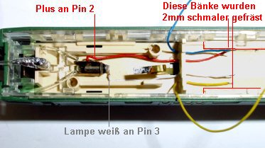 auf den Boden geklebt, dazu habe ich die Sitzbänke etwa 2mm schmaler gemacht. Man kann den Decoder auch auf die Bänke