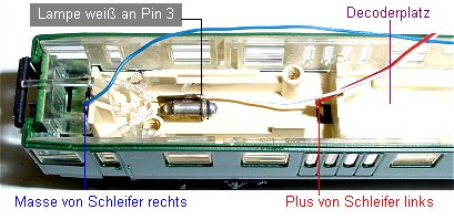 der Platine, Litze blau vom Decoder an Mitte blau, Litze weiß vom Decoder an weiß auf der Platine und Litze gelb vom