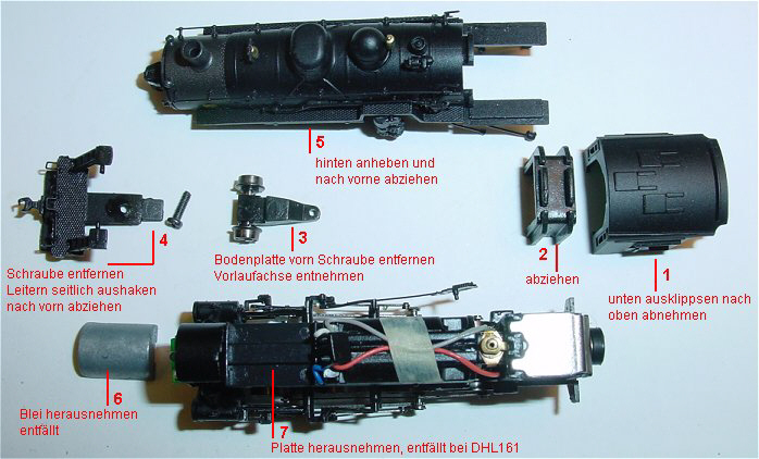 In der Reihenfolge der roten Nummern wird die Lok zerlegt.