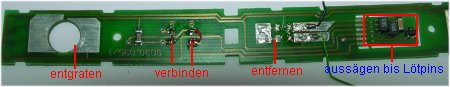 Kondensator an den Motorleiterbahnen entfernen. Den Platineneinsatz rechts mit einer Laubsäge bis an die Lötpads aussägen.