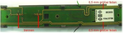 Auf der Platinenoberseite bei " T " zweimal trennen. Decoderanschlüsse bis auf 5 mm kürzen und den Decoder in den