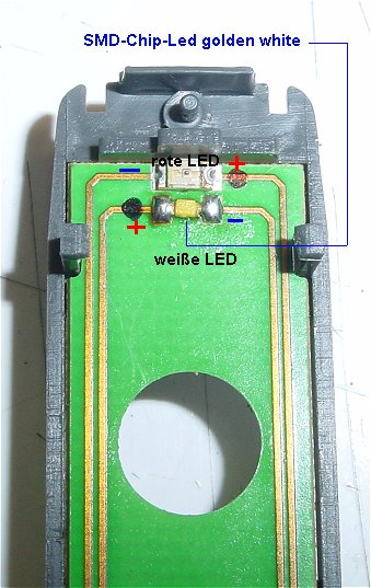 Darunter eine gleichgroße zweite, dies ist die weiße LED. Auf einer Seite Lötspitze dranhalten und mit Skalpell leicht anheben