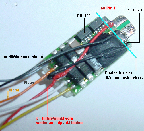 Originalplatine bleibt 1 mm plus die Verengung stehen. Pin 1 und 2 bekommen die Motorlitzen angelötet und Pin 5 und 6 die