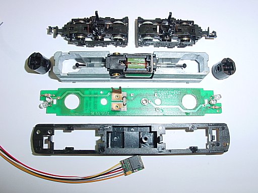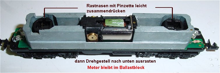 jeweilige Drehgestell unten aus der Platine ausrasten. Der Motor bleibt im Ballastblock und wird mit diesem zusammen von der