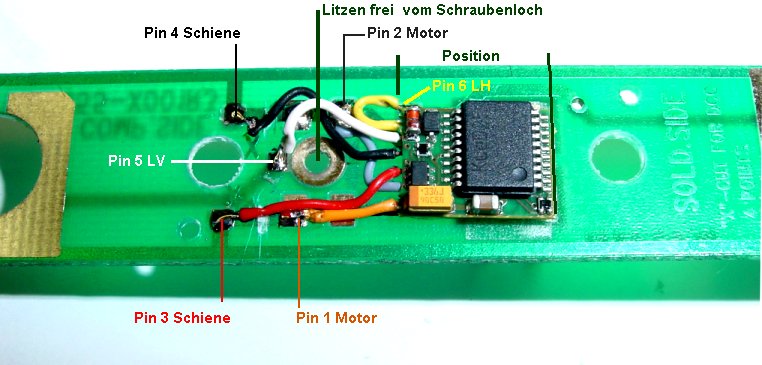 Die Lötpunkte sind mit Nummern entsprechend den Decoderpins gekennzeichnet und so wird Pin 1 orange an Nummer 1 gelötet usw.