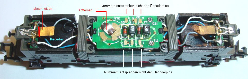 Hier wurden die Decoder Pinnummern gegenüber den aufgedruckten Nummern eingefügt. Damit die Litzen des Decoders besser unter