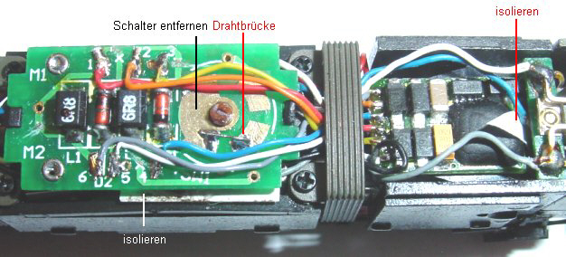 Schaltfeder entfernt, Drahtbrücke aufgelötet. Da der hier benutzte Decoder den Pin 7 rechts am Ende hat sollte hier ein