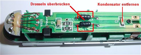 An der Platine des Vorderwagens mit dem Motor wird der Kondensator ausgelötet, beide Drosseln werden durch eine Drahtbrücke