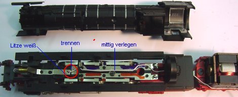 Diese Litze wird mittig, jedoch um die Befestigungslöcher im Bogen, nach hinten zum Tender verlegt. Man kann sie mit etwas