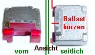 Das Ballastgewicht wird gekürzt. Die neue Form ist rot hervorgehoben. Links Ansicht von vorn, rechts von der Seite.