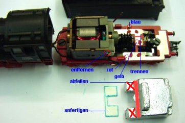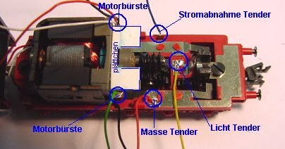 ebenfalls das Massekabel der Lok angelötet ist. An die Motorkohlehalter werden je eine Litze grün und schwarz direkt angelötet.