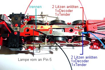 Beide Kabel von Lok zum Tender werden abgelötet, weil 5 Litzen zum Tender verlegt werden müssen. An Plus oben rot im Bild