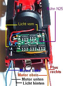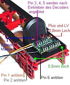 Hier gut zu sehen die beiden löcher oberhalb des Decoders. Da die Litzen des Kühn N025 zu dick sind um davon 5 Stück zum
