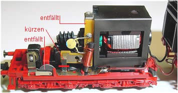 das Lokfahrwerk. Die rote Litze von den Radstromabnehmern rechts wird durch das rechte Loch gefädelt, ebenso die blaue