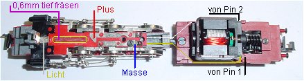 gemacht. Tiefe 0,6 mm. Hier wird später der Decoder mit angelöteten Litzen stehend eingeklebt.