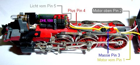 Der Decoder ist seitlich stehend, Anschlüsse nach rechts, Pin 1 unten, eingeklebt. Die weiße und die gelbe Litze führen