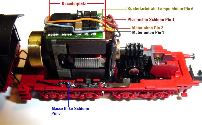 Der Decoder ist mit Doppelklebeband auf den Motor geklebt, vorne bündig mit dem Motor. Wer einen DHL050 verwendet braucht