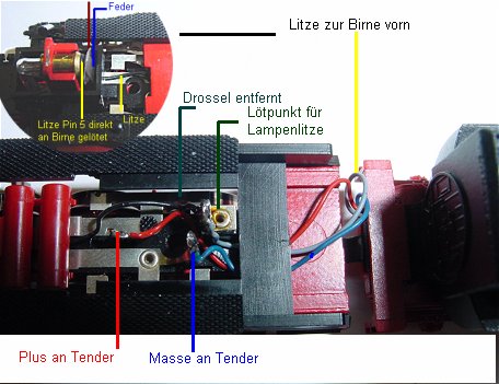 den Luftkesseln nach vorne verlegt und dort direkt an die Birne gelötet. Auf die Andruckfeder der Lampe wird