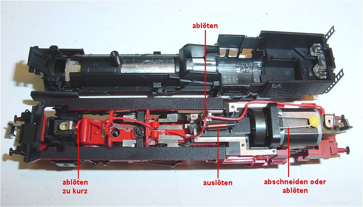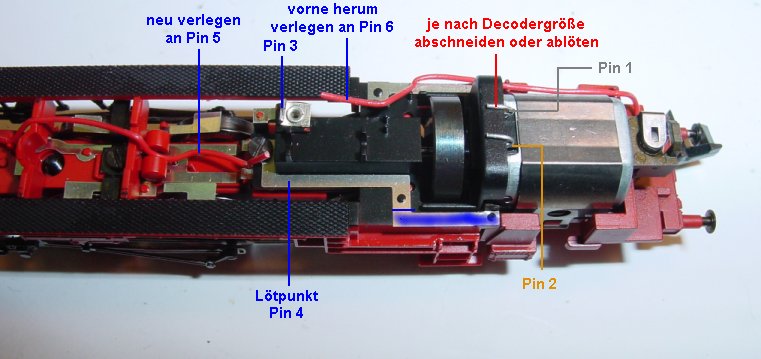 Wer einen kürzeren Decoder einlötet, der auf der Motoroberflöche Platz hat, braucht die Kondensatordrähte nicht