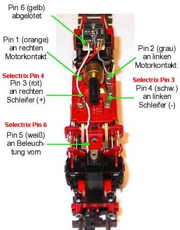 Einbau eines Selectrix DHL100 weicht nur in 3 Anschlüssen ab. (rot markiert Bild 4)