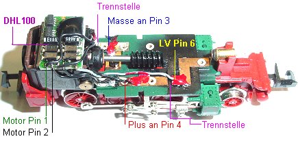 Decoder, statt Litze. Die Lötpunkte Plus und Licht vorn sind mit Nagellack isoliert gegen das Ballastgewicht im
