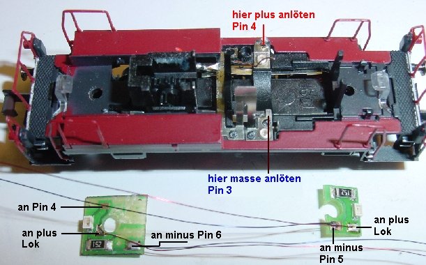 Da auf der linken LED-Platine der Plusdraht an die obere SchienenLötstelle führt wurde Pin 4 des Decoders an
