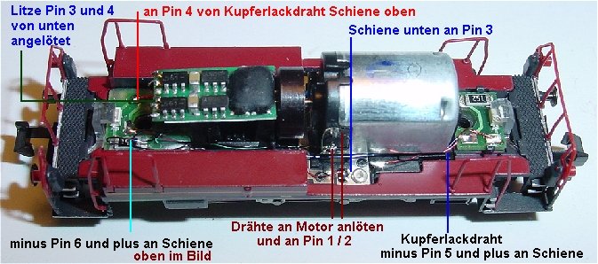 Die untere Schiene wird hinter den abgeschnittenen Federn angelötet und führt an Pin 3 des Decoders. Ich habe