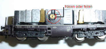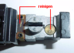 Am Fahrgestellblock wird mit einem Stückchen Roco - Rubber oder Tintenradiergummi die Schleifflöche auf beiden