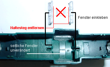 Der längsseitige Fenstereinsatz im führerstand wird herausgenommen. Der Mittelsteg wird mit einem Messer