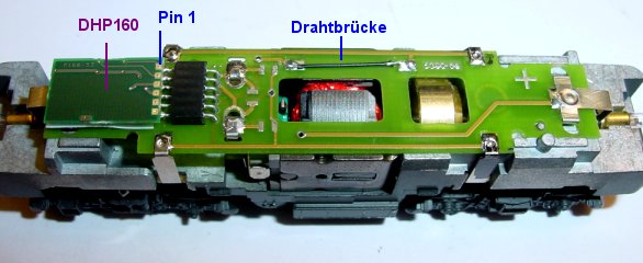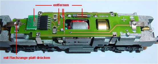 Drossel und 3 Kondensatoren auslöten. Analogplatine entfernen.Anstelle der Drossel wird eine Drahtbrücke eingelötet. Die linke Lampenfeder ist flachgedRückt und dadurch 1 mm niedriger. Der Decoder bekommt auf der Bauteileseite ein Stück Tesakreppband aufgeklebt damit die Decoder-Kondensatoren keine Berührung mit der Lampenfeder bekommen. Decoder "kopfüber" einschieben. Copyright Hinweis