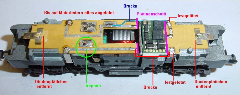 Decoderbreite geteilt. später wird oben und unten je eine Drahtbrücke eingelötet. Beide Federn vom Drehgestell