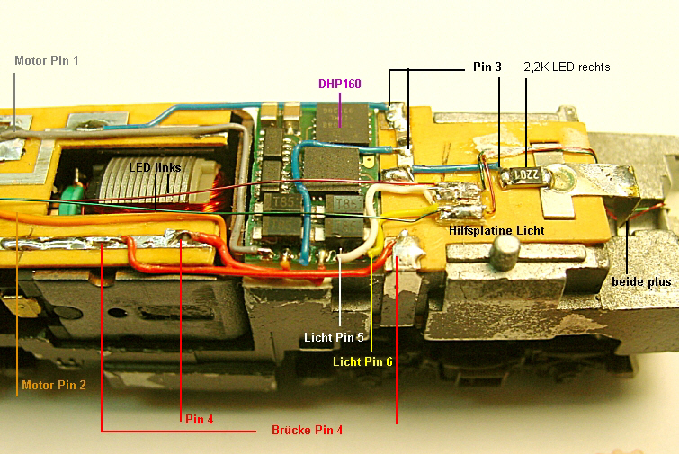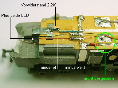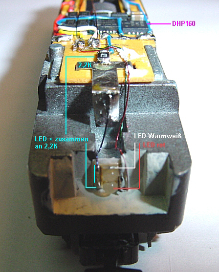 Der Decoder ist quer eingeklebt und die LED sind wegen den Platzverhältnissen mit 0,15 mm Kupferlackdraht verdrahtet.
