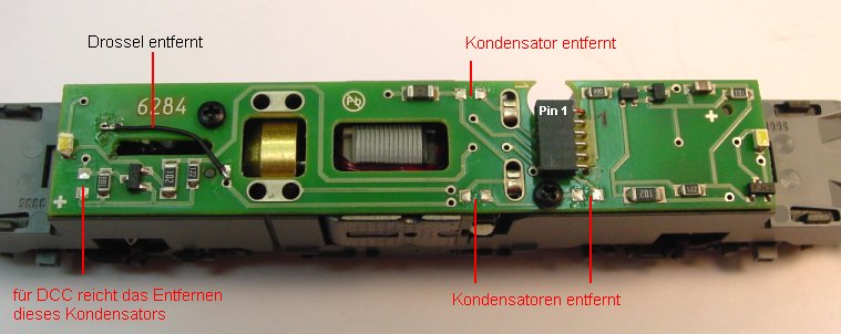 für DCC Umbau reicht das Auslöten des Pufferkondensators links rot im Bild. Wenn jedoch Probleme bei der