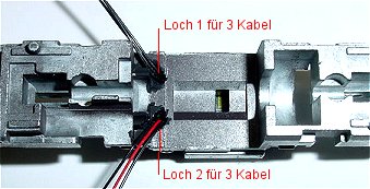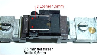 Vertiefung ist gefräst und zwei löcher 1,5 mm für je drei Kabel des Decoders sind gebohrt. Siehe rote Punkte im