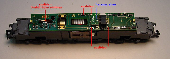 Bei Einbau eines Kühn N025 Decoders braucht nur die Drossel links entfernt, und durch eine Drahtbrücke ersetzt