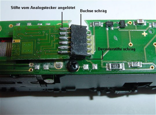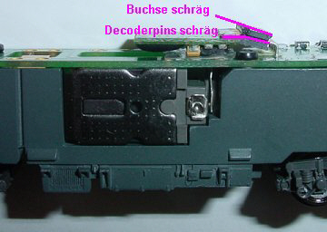 Stifte und Buchse gebogen, Decoder liegt waagerecht auf der Platine, Gehäuse passt.